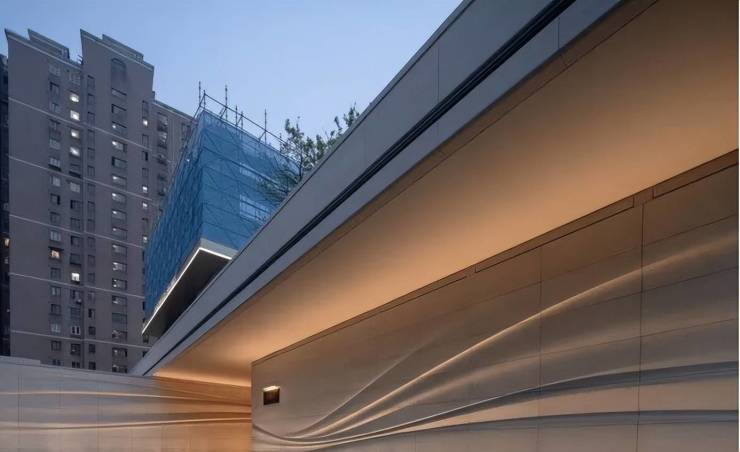 稍微走近一点就能看到采用了大量的弧形元素和石材材料。石材的质感本身就厚重,在上面叠加类似海浪的线条弱化了厚重感,反而显得轻盈。