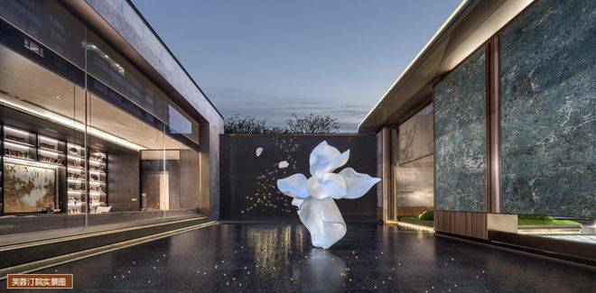 步入水院空间,风雨连廊一路伴水而进,镶嵌池底的星光灯熠熠生辉、高约5.5米挂壁飞瀑声、红果冬青的自然林韵、亚马逊绿岩板与芙蓉雕塑呈现的“绿野繁花”盛景……