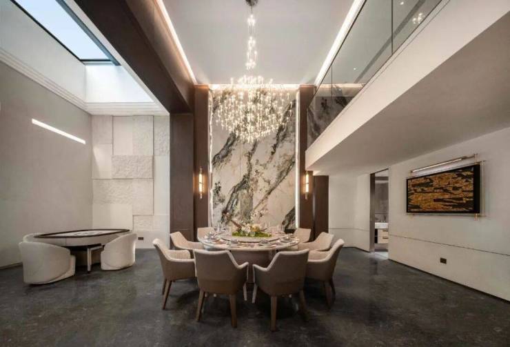 建筑采用三重屋檐形制,承载天地人相融的东方礼制,搭配铝板、格栅、伊朗进口蓝眼睛石材、大面积灰蓝落地玻璃、香槟色铝板,南北立面均高标准打造,卓越窗墙比勾勒光影天幕,演绎当代东方大宅气度。
