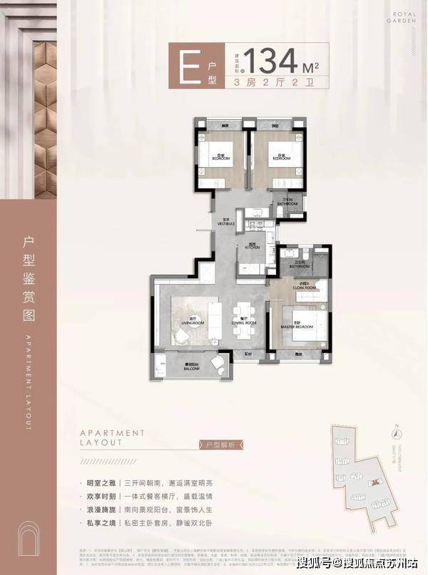此户型可以说是改善人群非常喜欢的户型,3房2厅2卫设计,动静分区,三开间朝南还有一个超大面宽的景观阳台,实现功能性和舒适度兼得。