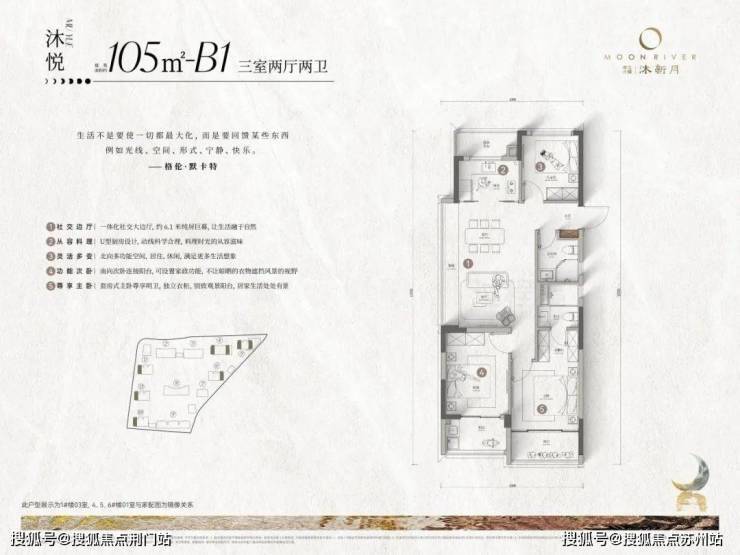 建面约105方户型有两款,一款是“四开间南户型”,每个房间都向阳,还是准双套房。另一款是少见的边套户型,自带约6.1米大边厅,套房主卧,功能性和舒居感兼备。
