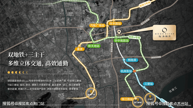 地铁方面,沐新月畅享4/6(规划中)双地铁线,直线距离华中南路站约300米,1站新天地、5站杭州东站、6站西湖文化广场、9站钱江新城…是当之无愧的双地铁楼盘,对CBD上班族相当友好。