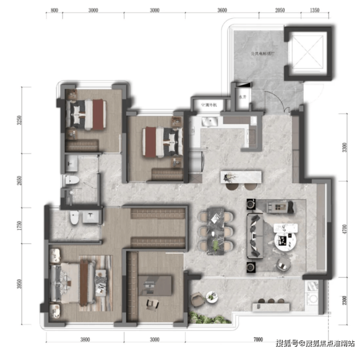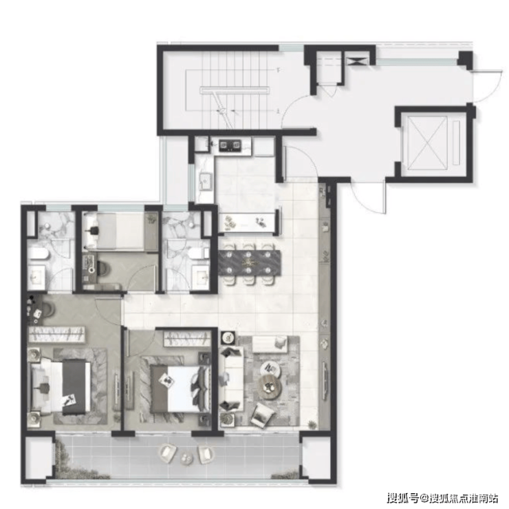 In simple terms, the tower is centered around the elevator and staircase, and after reaching the floor, one can directly enter the apartment by walking in any direction.