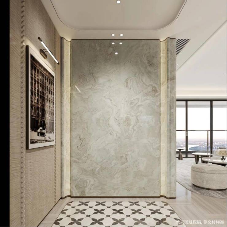 且覆盖面极广泛,客厅的地面、电视及玄关背景墙,卫生间、卧室、厨房的门槛石,卫生间淋浴房地面等空间都满足。
