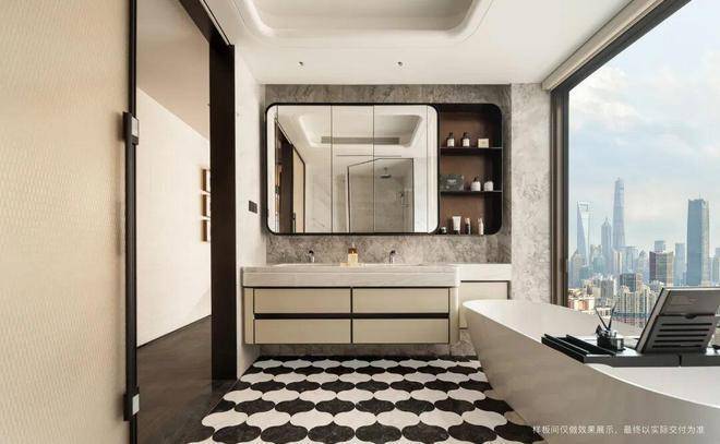 主卫空间以鱼肚灰大理石与博雅白台面精工对拼,防水防潮皮革,香奈儿灰与星耀灰石材拼花地面,升级独立浴缸与尺度双台盆,营造艺术馆般的奢享境界。