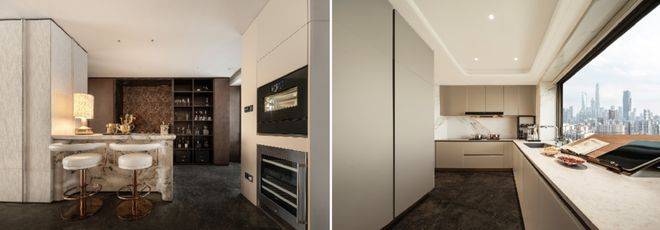 厨房内竹纹夹丝玻璃门、威乃达坡璃烤漆橱柜、与卡拉拉金大岩板台面相融,同时嘉格纳十件套满足每一种味蕾的偏好,厨房内,灶台/油烟机/洗机/冰箱(独立分体设计)五件套;向外,嘉格纳咖啡机/暖碟机/酒柜/烤箱/蒸箱等西厨五件套配置,构筑中西共融的烹饪场域。