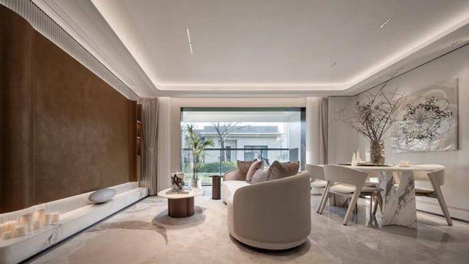 项目采用鎏金塔冠造型,灵感来源于国际邮轮港的曲线,流光美学的外立面,既有辨识度又有质感,是未来业主身份的象征。阳光倾泻而下,在不同光影与环境下,让家成为一件艺术品。