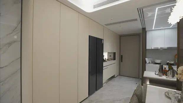 上海杨浦中建壹品·外滩源著售楼处电话:400-9939-964值得一提的是,入户玄关设置一整面的玄关柜空间左侧分户墙处增设“凹型空间",预留内嵌双开门冰箱空间。