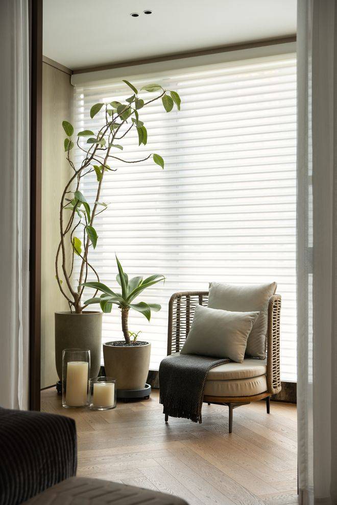 与自然共生,体验质感生活。客厅以米白和棕色为主色调,呈现出雅致而简约的空间氛围;融自然美学于现代高品质设计理念中,在绿意盎然的植物中延展出客厅空间的开放属性,定格家庭聚享时刻。