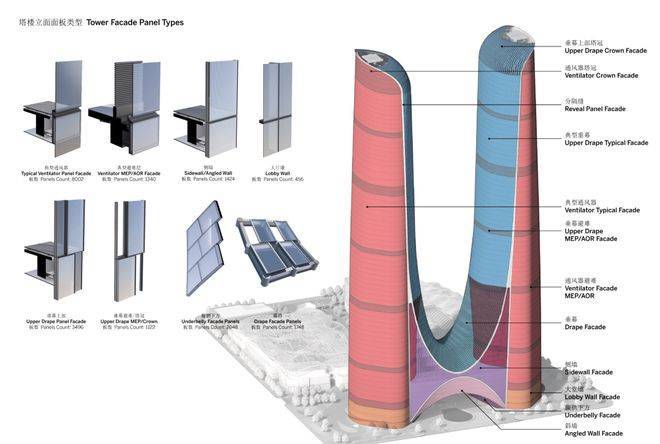 双塔外侧的幕墙单元均经过