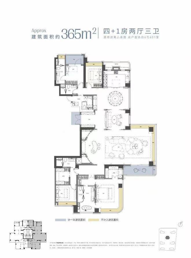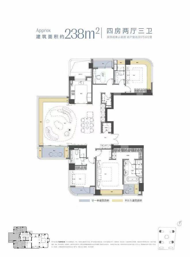 -【约142㎡IMAX四房】:主力总价约2200万-2400万,约5.9米阔尺宽厅、约15.4米南向面宽,四开间朝南+主卧套房设计,匹配塔尖人群终极改善需求。