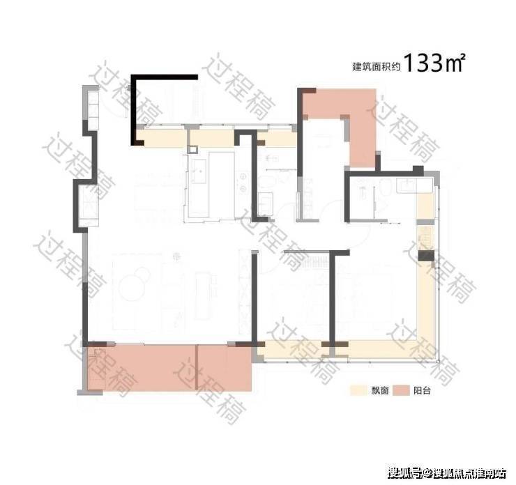 户型配备大面积飘窗(浅米色区域)和阳台(浅粉色区域),飘窗可引入柔和的自然光线,提升卧室等空间的明亮度;阳台则进一步拓展了采光面,同时有利于空气流通,保障室内通风效果,让空间更显通透舒适.