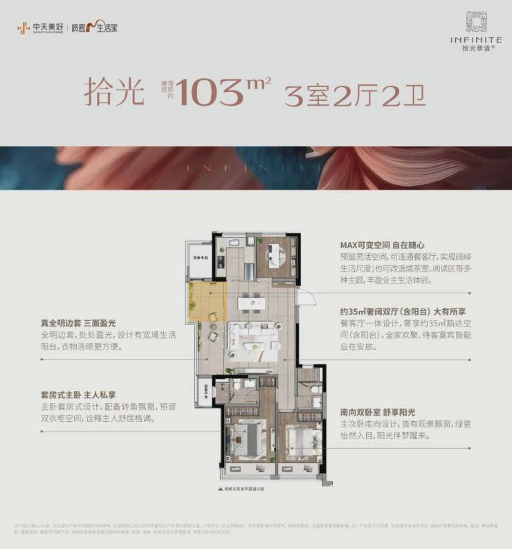 建面约103㎡的边套更是堪称神迹,将小户型的空间魔法玩到了极致。客厅到阳台的地面、天花直接拉通,甚至两侧的墙垛都已隐身,整个餐客厅面积达到约35㎡(含阳台),这可是140㎡以上大宅才有的空间感!