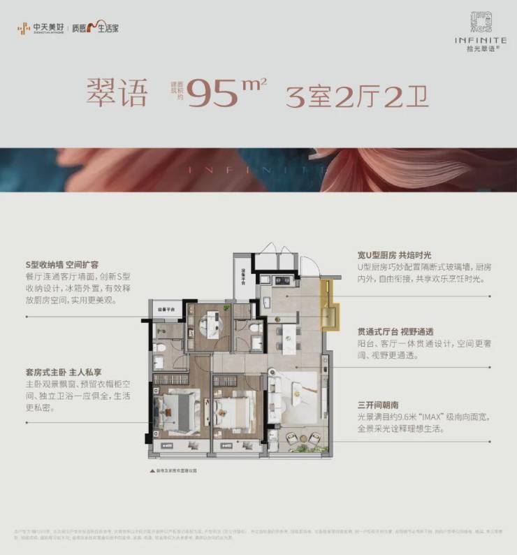 全盘共434套可售房源,只设置建面约95㎡、103㎡两个面积段,比大部分楼盘的起步户型节制了至少10㎡,足够省出一辆车了。同时,藉由“阳台只计一半面积”的优势,让每一套房子都有着90%以上的使用率!