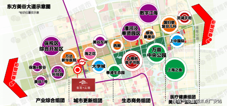 根据奉贤官方的规划,东方美谷大道将形成五大组团,形成特色鲜明的发展轴线,自西向东分别为: