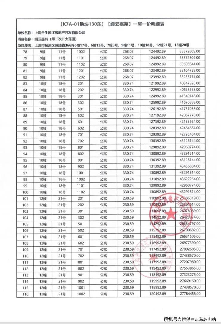 一房一价表如下