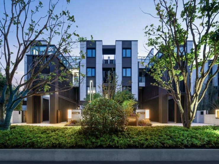 项目联排外立面采用素白色花岗岩石材,点缀建筑的造型线脚选用挺拔的深咖色铝板,整体风格营造一种江南特有的水墨意境。
