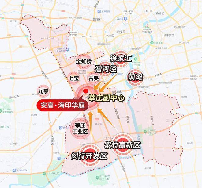 但若你从地图上看,莘庄恰好就处在“心脏”地带,漕河泾、七宝、莘庄工业区、航天城、闵开发、紫竹就像众星拱月般将莘庄环绕在中间。