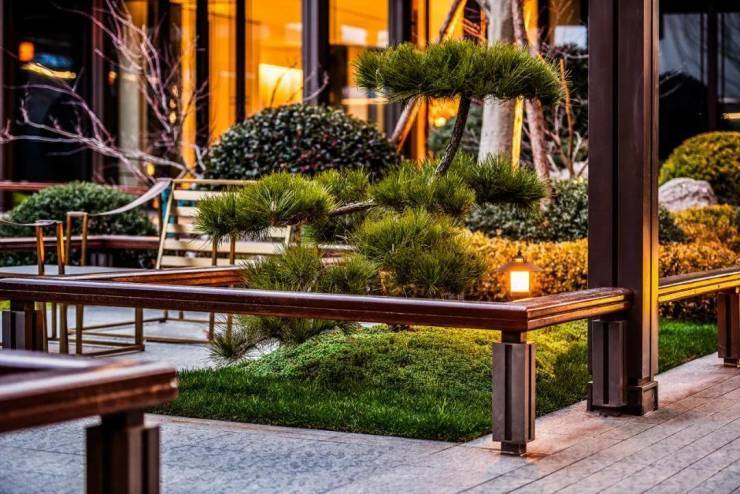 在景观设计领域,贝尔高林团队以“新中式园林”为核心理念,汲取龙坞山水如诗如画的自然灵感,巧妙提炼茶的精髓,将内庭院墙、山石青松、镜面碧波等元素融入溪映听庐的东方雅韵之中,营造出一方静谧和谐的居住境界。