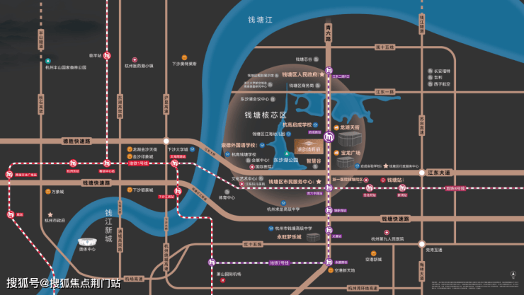 除了景观,在湖韵清晖府的东侧,出门就是龙湖江东天街;往北走约150米,就是地铁7号线启成路站,无缝对接杭州的城市脉络;往南走约500米,是宝龙广场,整个江海之城,最为核芯的商业体,几乎都集中在了湖韵清晖府的周边。