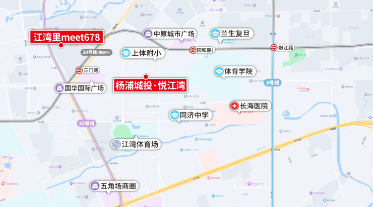 项目2公里半径覆盖有丰富的业态,配套包括国华广场、中原城市广场、江湾里meet678等商业,长海医院、东方肝胆外科医院、肺科医院等三甲医院。
