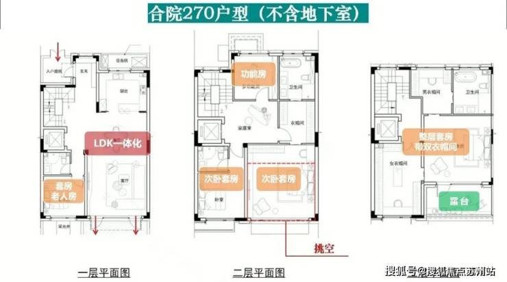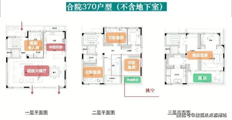 联排三款户型,建面约271㎡/325㎡/369㎡,均为地上三层设计,地下室地下挑高5.6米,可隔2层。