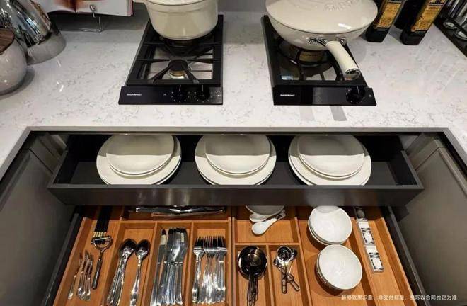 为使厨房成为「真正幸福之地」,璞元在各个细微之处倾注关怀,从地柜拉篮系统,到上柜系统,再到抽屉分格系统,浅抽与深抽搭配,让整个厨房空间,既百变,又充满秩序。