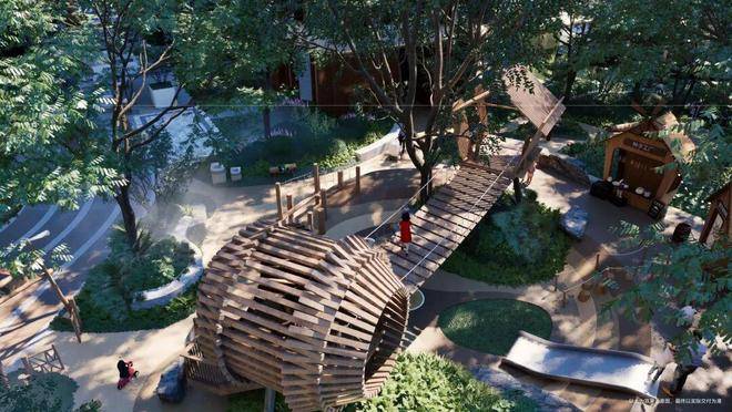 儿童乐园也被完美结合进了自然探险的主题之中,从树屋到自然客厅,有了全域驱蚊雾森系统,孩子可以在安全可控的环境中,接触原生态的自然艺术。