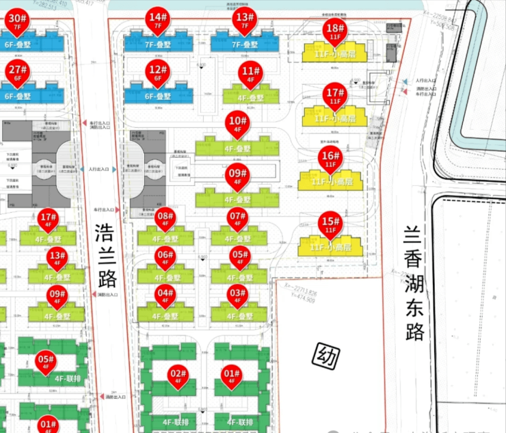 03-04地块:东至兰香湖东路,南至兰香湖北路,西至浩兰路,北至东川路,土地用途普通商品房,容积率1.01;由4幢11F高层住宅、14幢4-7F多层住宅以及若干社区配套用房组成,共计规划约342套可售住宅;