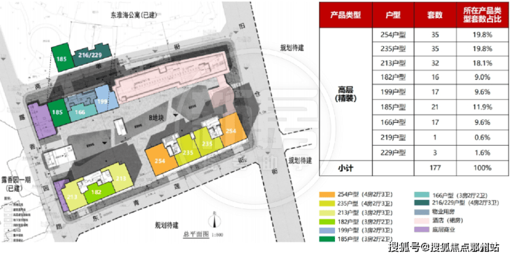 B住宅:约3.8万㎡高层产品,共177套,套均面积约216㎡;