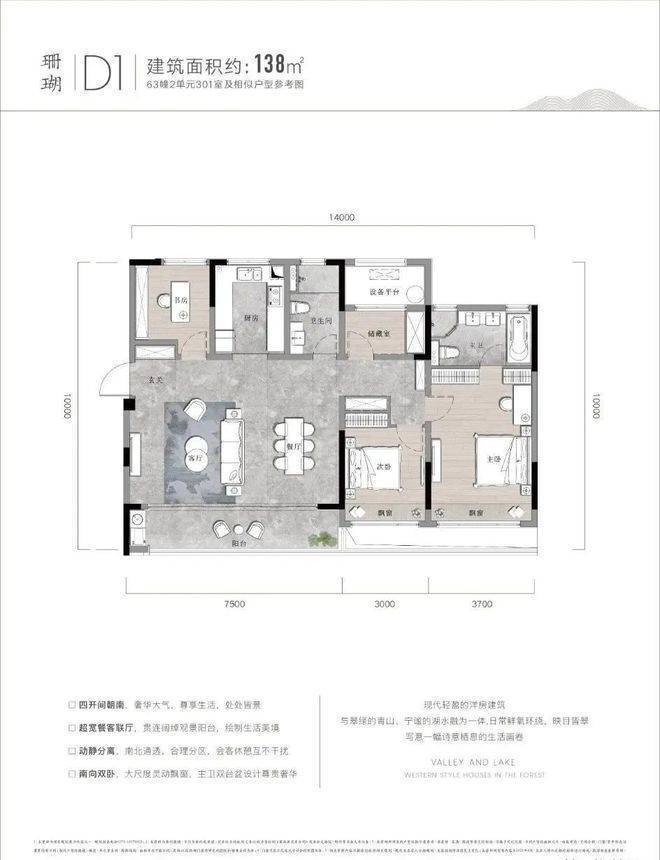 户型点评优势:双阳台设计,完美匹配湖山美景。客餐厨动线合理,观景飘窗连通了室内室外两重空间。南北通透、分区合理,尤其是储藏室的设计,十分贴心。99㎡的大两居,恰到好处地放大了各个功能区,整体看过去十分舒畅。