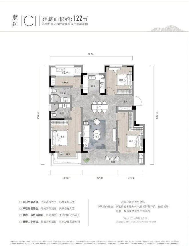 户型点评优势:122㎡的三房两厅两卫设计,留出了独立的玄关收纳空间与落尘区,十分贴心。三个房间分布在三个方向,空间都不显局促,主卧更是自成一体。客厅连阳台,一动一静之间景观尽收眼底。