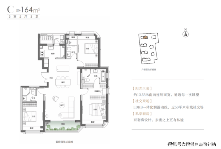 建面约164㎡的三房两厅两卫户型