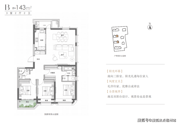 建面约143㎡的三房两厅两卫户型