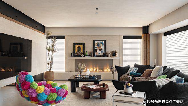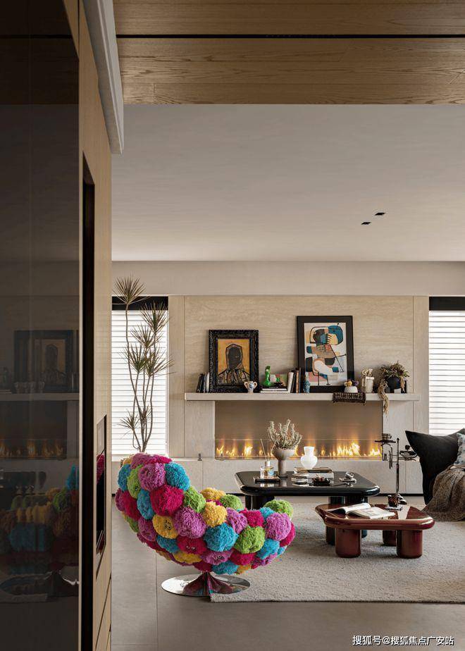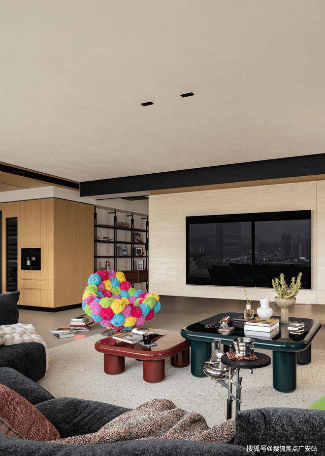 客厅色彩与光影交织,犹如复调的交响,层次分明,喧嚣与静谧并存,矛盾却不冲突。色块如同低语的音符,在空中编织,形成一种看似无序的秩序。