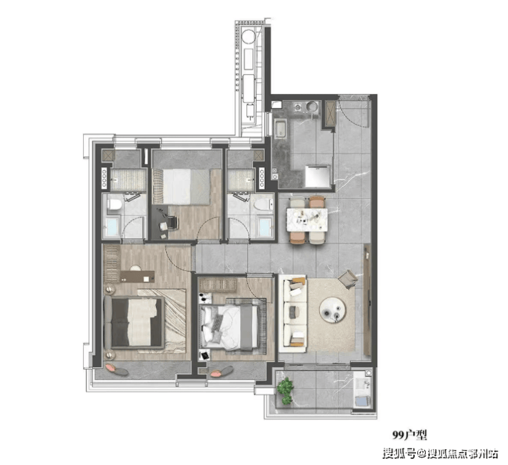 建面约99㎡三室两厅两卫:舒适改善三房,总价699-790万,全明通透设计,主卧套房设计保障私密性,空间利用率高,可满足三口之家的多元生活需求;