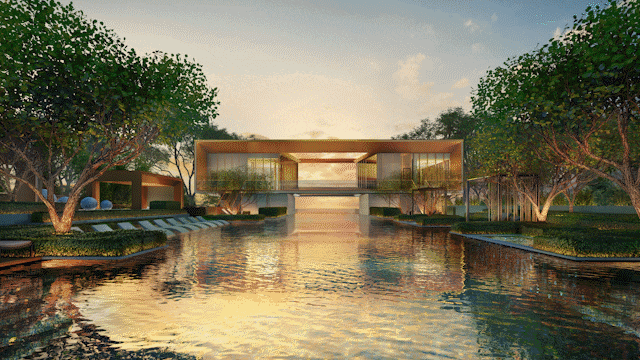 整体园林景观以新加坡美学为灵感,打造了“一环两轴四带”规制。