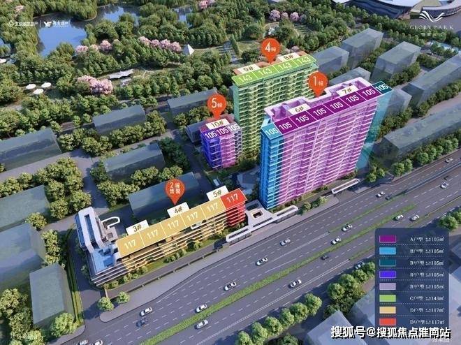 建面约 105㎡三房两厅两卫:采用经典南北通透格局,客厅开间约 4.2 米,搭配同等尺度景观阳台,三个卧室均带飘窗,主卧为独立套间,得房率高达 74.4%-79.3%。