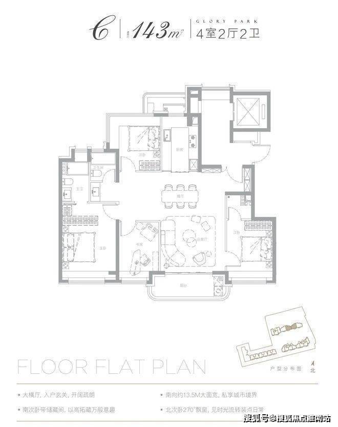 建面约 143㎡四房:四开间朝南,老人房与儿童房分置两端,主卧套房配备步入式衣帽间与观景飘窗,有可变空间。