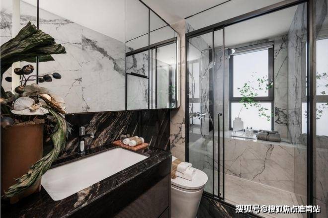 卫浴墙面采用寒江雪大瓷砖铺装淋浴部分地面选用整块天然大理石