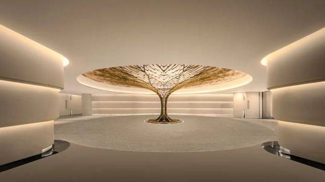 公区大量运用米白或米黄色石材,随处可见温润曲线元素,高级感在空间无界流动;巨大的扇形华盖,景墙如滚滚波浪;三层观景环厅“生机之亭”,四根巨柱呈现向上生长的旺盛生命力;还有中央车站价值百万的“黄金树”…
