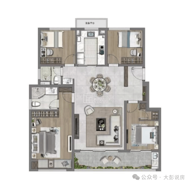 约120㎡的户型,约23㎡主卧套房沉稳大气,独立卫浴起居更从容,搭配仪式感漫漫的衣帽间,顷刻化身独家秀场,重塑精致生活尺度。