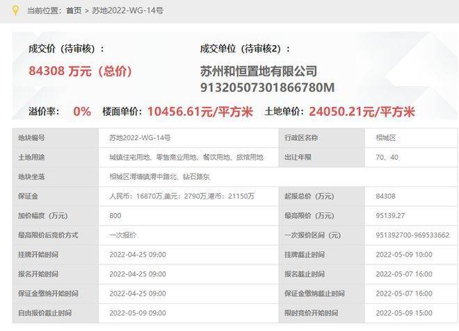 2022年5月9日苏州土拍中,苏州和恒置地有限公司(相城城投)以8.43亿元底价竞得,楼面价10456.61元/m²。地块性质为城镇住宅用地、零售商业用地、餐饮用地、旅馆用地。