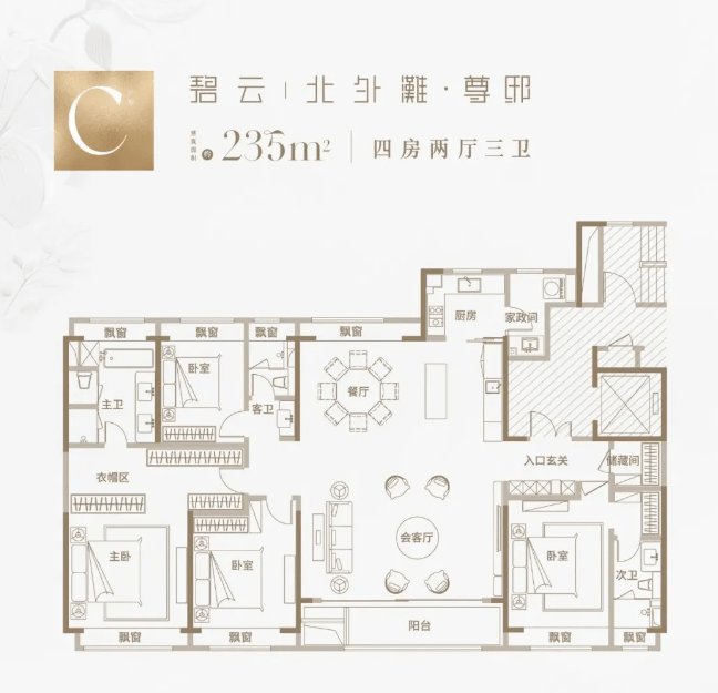 建面约235㎡四房 餐客厅面积达到近60㎡