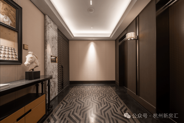 建面约270㎡五房 南厅户型:有边厅和南厅两款:两梯两户+双开门贯通电梯,实际使用起来有近似“两梯一户”居住体验。巨大的电梯厅面积将近13㎡,精装奢石和木纹铝板。从尺度到装标,都冠绝杭州住宅领域。