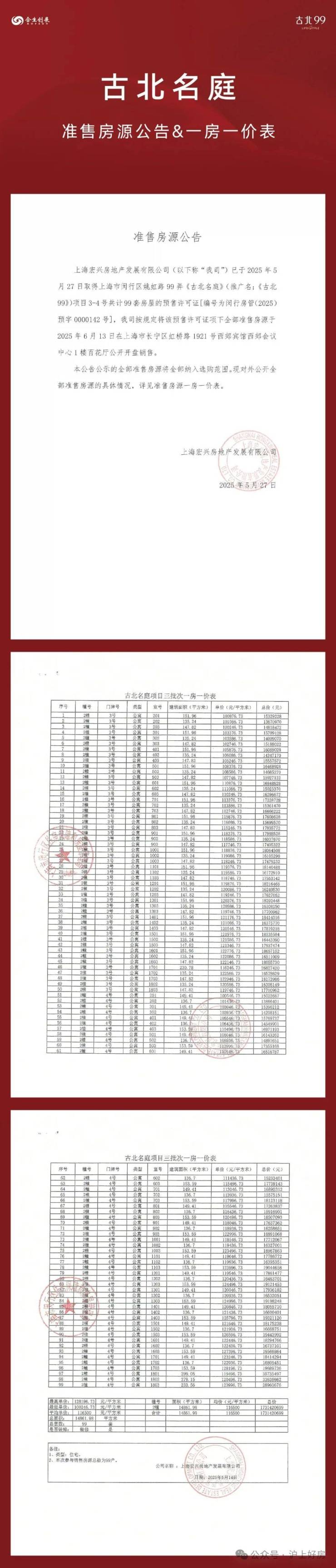 据悉,【古北99】加推2号楼,合计99套房源:包括建面约135-154㎡3-4房,建面建面约230-299㎡复式房。均价约为11.65万元/㎡,即将入市,前期少量房源可直接认购!