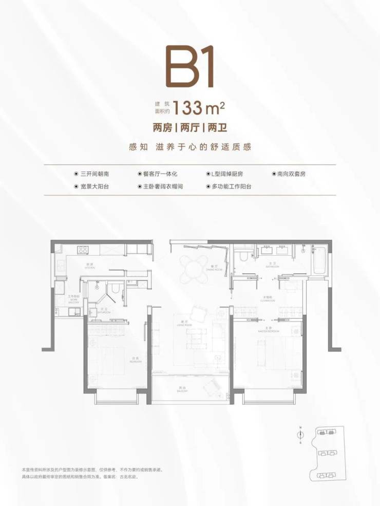 户型全明通透,134-154㎡三房客厅面宽达4.5米,主卧套房设计