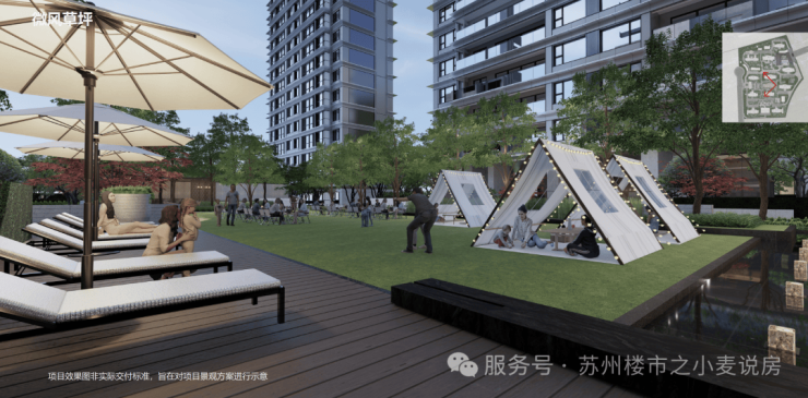 设计师考虑到社区邻里的闲暇共聚,甚至未来的社区集市,特意配置了400㎡的微风草坪邻里共享聚场,用草地、雕塑、平台、躺椅、树阵、景墙等元素填充,这里将会成为小区最热闹的场景之一。