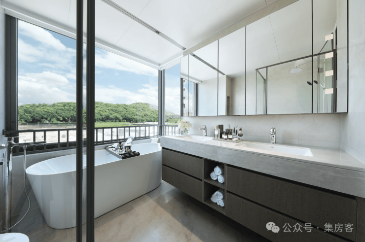 公建化的立面,四面铝板搭配大面积玻璃,阳台统一封包,底层的浅色天然石材还被打磨出弧线,脱去厚重外壳,轻盈洒脱。项目西侧直线约800米就是钱塘江,春来晴翠也在园区里编织了一幅山水画卷。