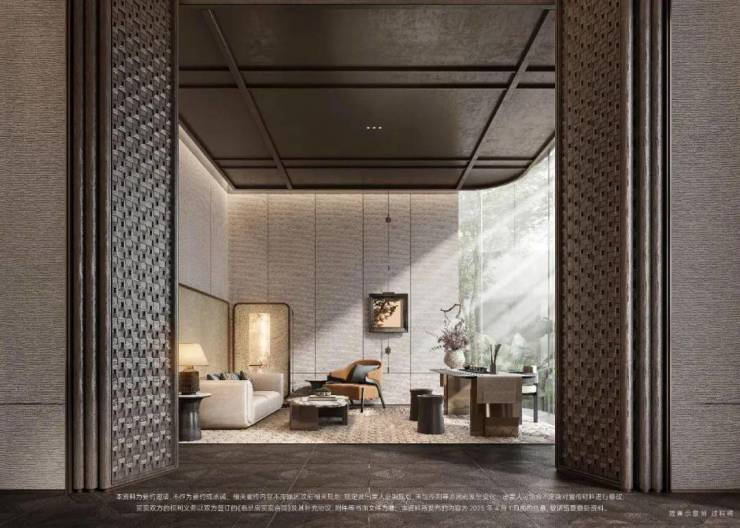 双轴线的设计,充分拓宽了视野面与观赏点位,环形回廊、精神游廊与下沉庭院通过立体景观平台相融,又创造出隔岸听泉的诗意场景。在每个重要生活触点,业主都能拥享独特景观和欣赏视野。
